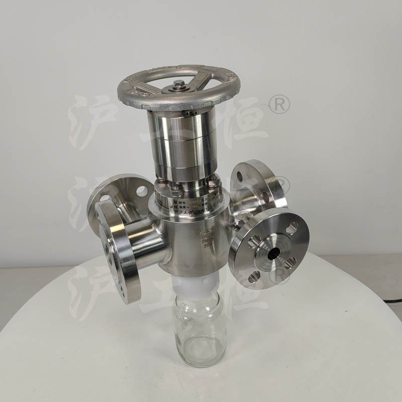 GHSZZSQYF-16竖直装在线取样阀用于竖直管线在线取样,取样介质真实, GHSZZSQYF-16竖直装在线取样阀主要有阀体、阀芯、阀杆、阀座、排气口,竖直装取样接头、取样瓶组成,取样瓶为可拆卸设计,试样进入取样瓶内,配套的瓶盖可将取样瓶密封,避免污染试样,取样阀流道无滞留、无流阻设计,不影响流量,阀杆通过手轮旋转带动阀杆及阀芯,阀芯上下提拉,可精确控制流量,精确控制取样量,使试样进入取样瓶内,取样瓶可选透明和避光两种,本取样阀广泛应用在制药、化工、食品行业。